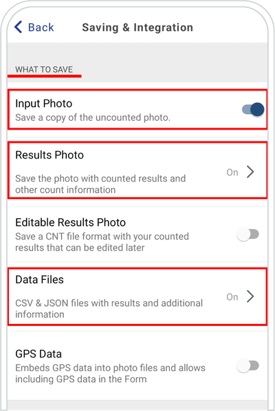 From WHAT TO SAVE section, you can choose the data you want to store when you press SAVE in our app. In this example, we want to save the Input Photo and the Result Photo. The Data Files are toggled On because we want to generate a Result Data File (CSV File).