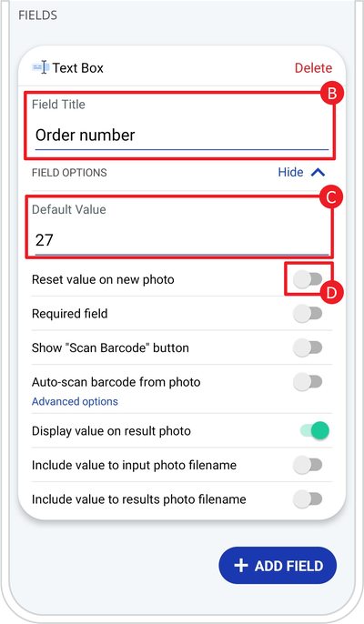 D. Switch on or off the toggles from the Text Box FIELD OPTIONS (e.g. we switched off the toggle from Reset value on new photo)