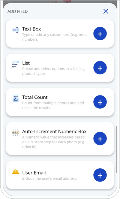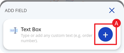 A. + ADD FIELD ➜ Tap the „+” button from Text Box