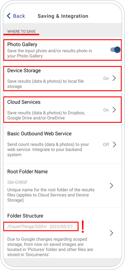 For a better management of the counting data, we decided to have the Device Storage and the Cloud Serviced toggled On. By doing this, we are saving our result data locally on our device and also externally using a cloud service, such as Dropbox, Google Drive or OneDrive.