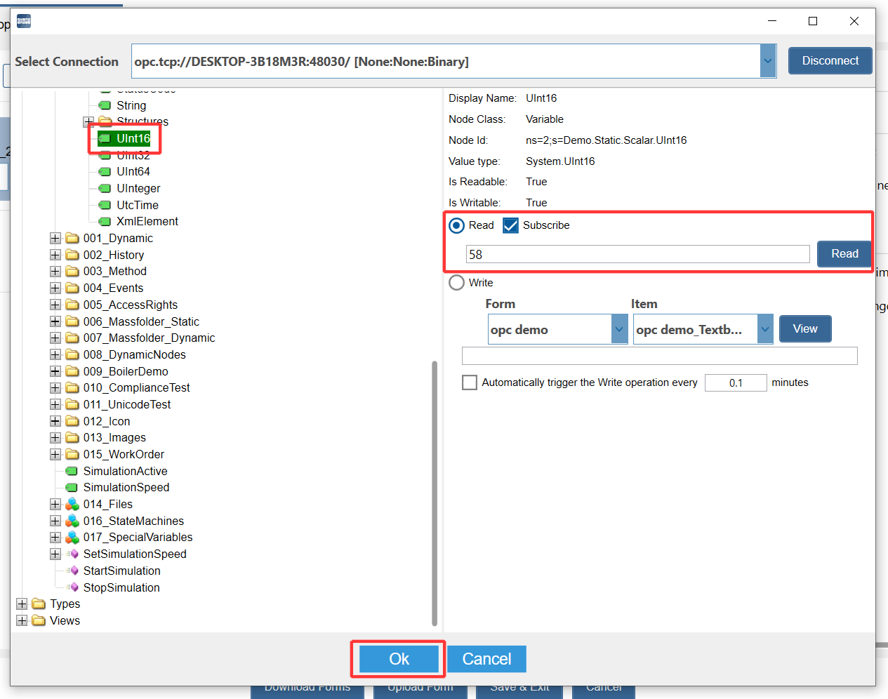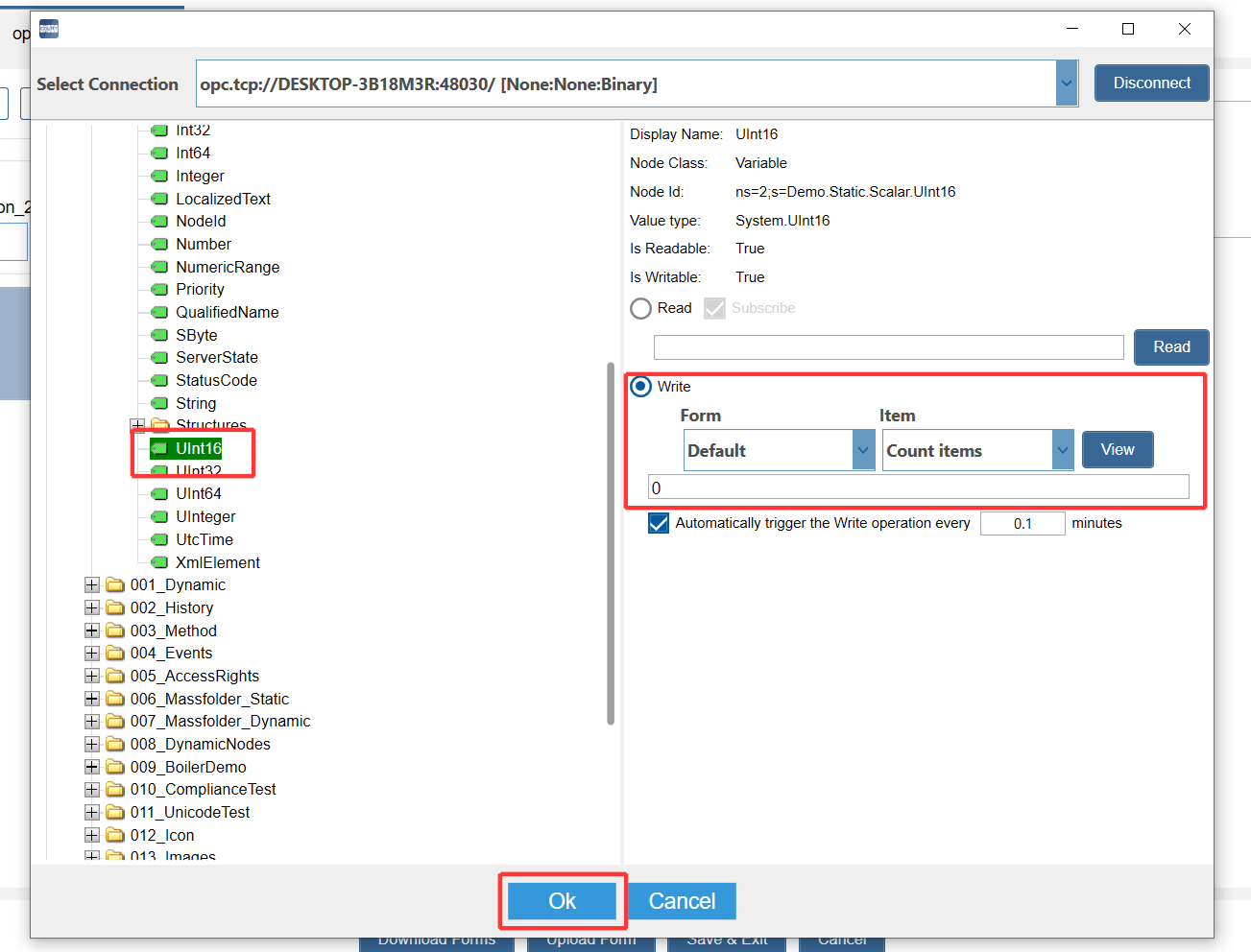 5. Write the count results with OPC server: