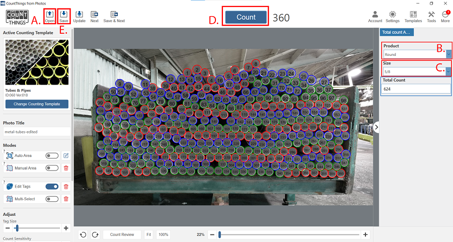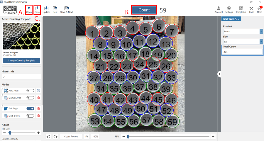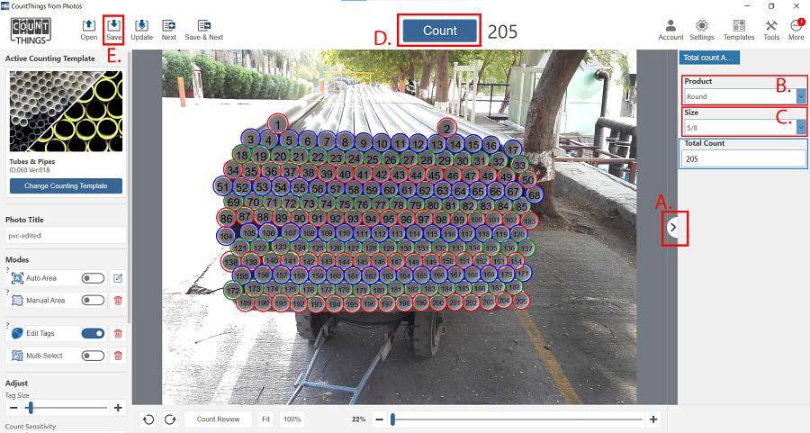 3. The first photo we want to add to our total count is with pipes (Product = Round), Size 5/8: