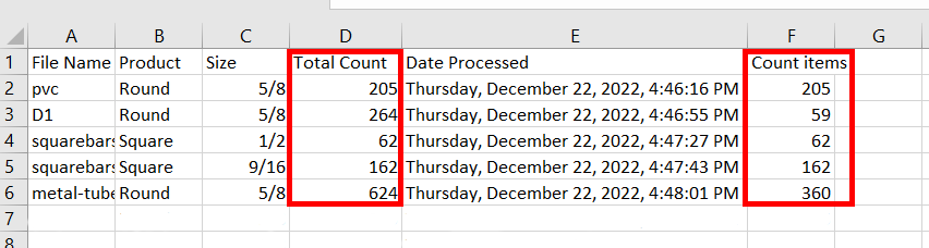 7. The fifth photo we want to add our total count is again with pipes, (Product = Round), size 5/8: