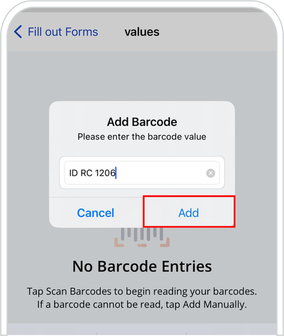 7. Type the barcode value ➜ tap “Add”.