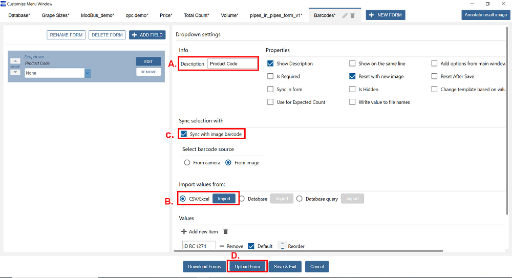 C. Go to Sync selection with ➜ Check Sync with image barcode. Select then your barcode source (camera or image).