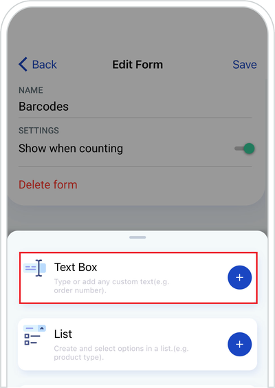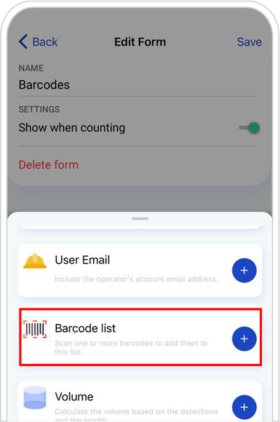 2. Add the Barcode List field by tapping “+”.
