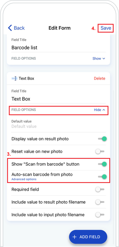 3. Open FIELD OPTIONS ➜ Turn on the “Scan from barcode” button and select the auto-scan barcode from photo option.