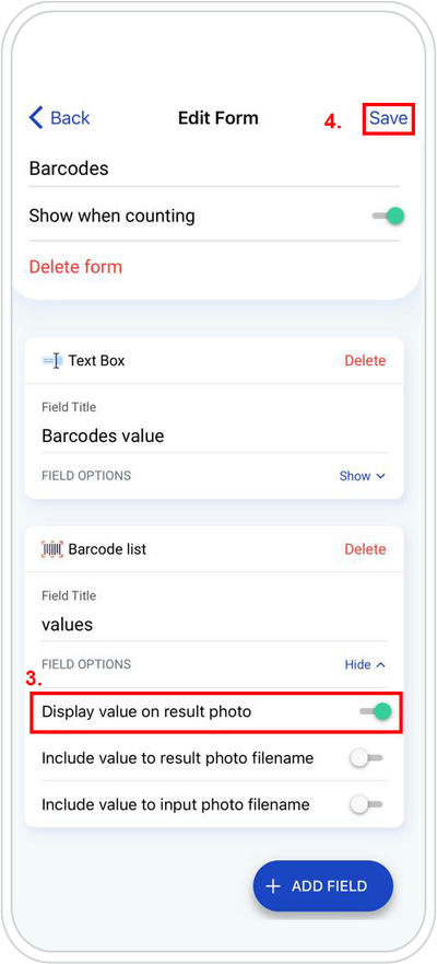 2. Add the Textbox field by tapping on “+ ADD FIELD” and give it a relevant name (eg. Barcodes value).