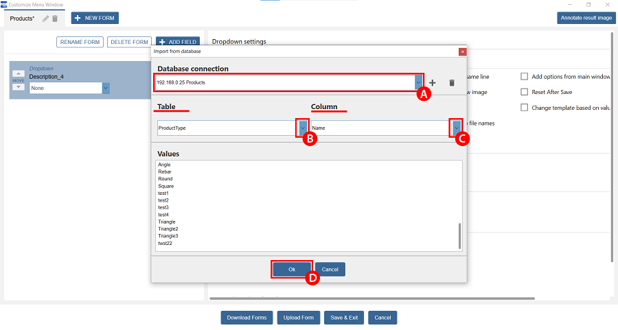 7. Repeat the process by adding the data relevant for your counting. In our example we added 3 more dropdowns and imported 3 more product data from our database (e.g. Size, Length and Bundle Pieces