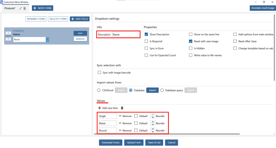 6. Your Dropdown description will automatically be changed to the name of the imported column (e.g. Name), and you will be able to see the added Values by scrolling down the screen.