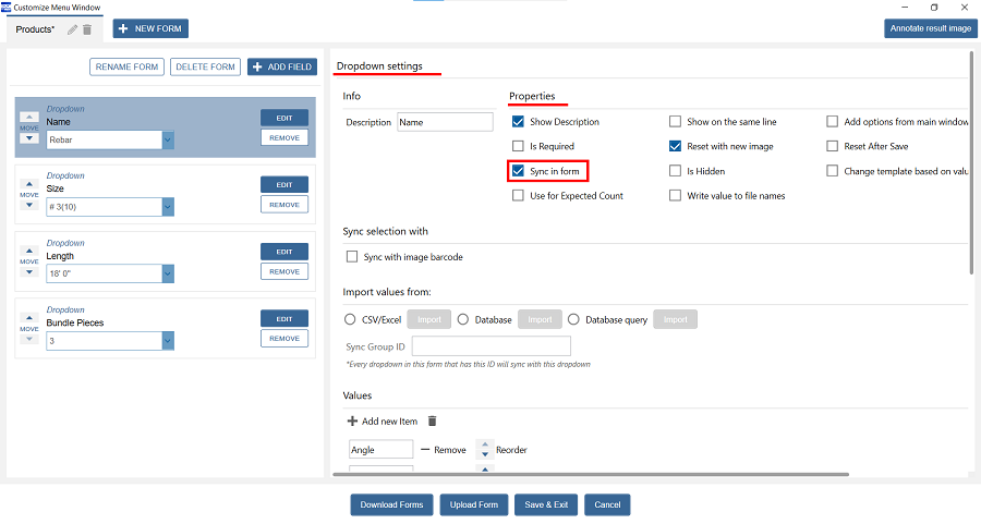 2. Dropdown SettingsProperties ➜ Check Sync in form