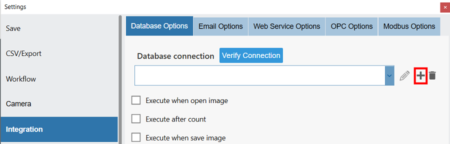 2. Assuming that you don’t have an already existing database connection, click “+” button to add one. If you already have existing database connections, select the relevant one using the dropdown.