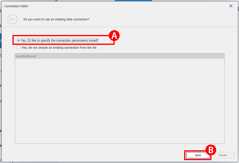 A. Choose if you want to use an existing data connection (e.g. No, I’d like to specify the connection parameters myself)