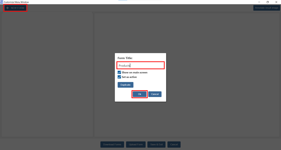 2. Click on +NEW FORM ➜ Give your Form a relevant name (e.g. Products) ➜ Click Ok