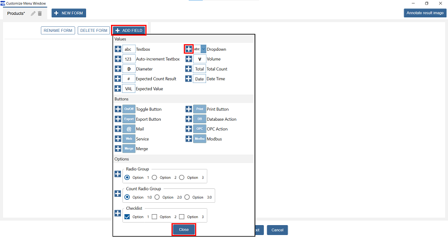 3. Click on +ADD FIELD ➜ Click on the “+” button for DropdownClose