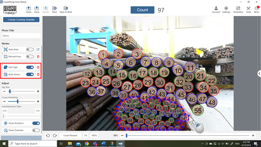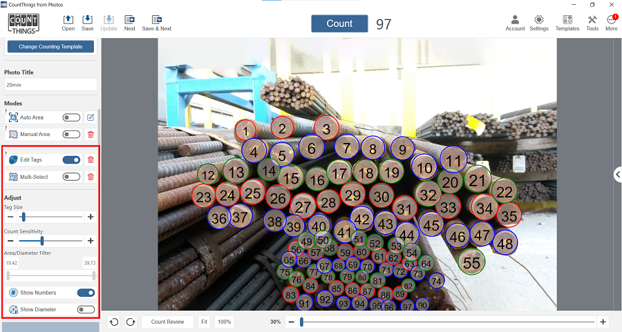 - Switch on the Diameter toggle to see the diameter of your counted items.