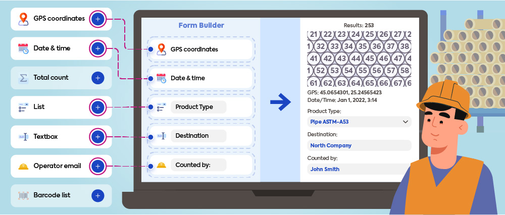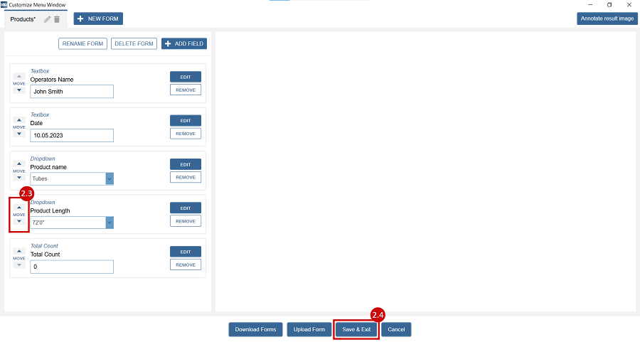 We added more fields – Two Textboxes: we edit them to represent the Operators Name and Date; two Dropdowns – Product Name (we added multiple types of products as value in dropdown) and Product Length (we added multiple lengths as values in dropdown) and a Total Count.