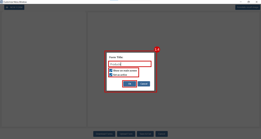 1.4 Give it a relevant name and make sure to have Show on main screen and Set as Active options enabled ➜ Click Ok. (for this example, we named the Form Products).