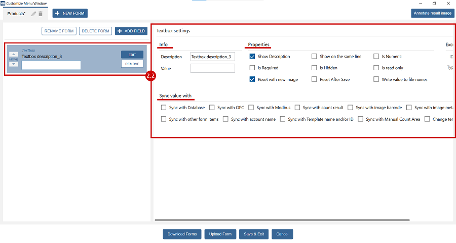 2.2 For every Field added, on the left side of the screen you will see the selected Field, and in the right side you will see the Settings of that field (Info, Properties, Excel export, Sync Value with).