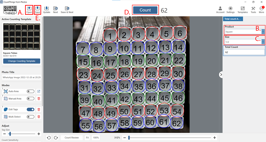5. The third photo we want to add to our total count is with square tubes, (Product = Square), Size 1/2:
