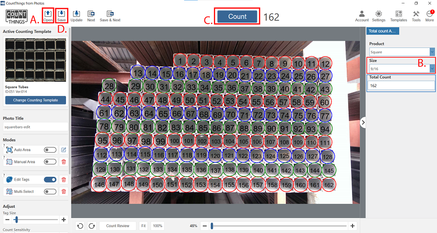 For a better understanding of the Total Count feature, we will take the following scenario as an example: It’s inventory day and your company has to count two types of products: Square (square tubes) and Round (pipes), having different sizes. We will export the results in a CSV file.