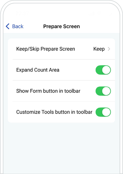 Expand Count Area - Switch off this toggle if you want to restrain the Count Area Menu in Prepare Screen toolbar.